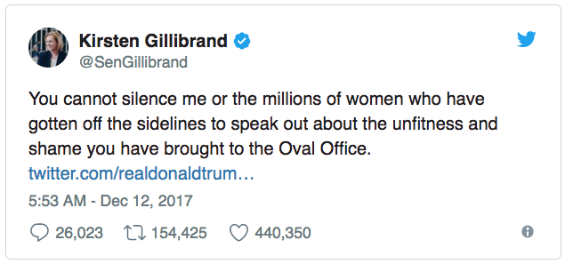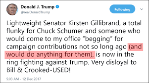 U.S. Senator from New York. #45 tweet-trashed her [date], implying that she offered to trade sexual favors ("do anything") for campaign donations.
